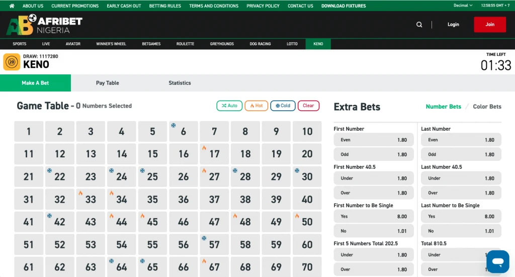 With its 24/7 availability, Keno on Afribet.ng fits perfectly into any schedule. Players can enjoy a game or two whenever they have a few spare minutes. This convenience is a significant advantage, providing endless entertainment opportunities day or night.