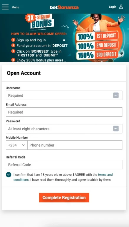 To register on a mobile device, locate the 'Register Now!' button on the upper right corner, tap 'Open Account', and enter your username, email, password (minimum eight characters), and mobile number (with +234 country code). Add a referral code, agree to the terms and conditions, and confirm you are 18 or above.
