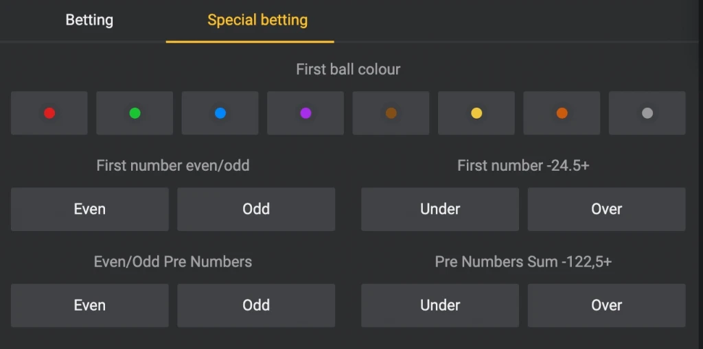 The main types of bets include betting on numbers, colours, the sum of the numbers drawn, and whether the majority of numbers will be odd or even. Players can also place special bets, such as predicting the first or last ball number or the count of colours.