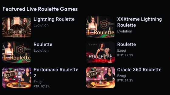 The casino features live roulette games like Lightning Roulette, Xtreme Lightning Roulette, and Oracle 360 Roulette, mainly from providers like Evolution and Ezugi. These games offer various takes on the classic roulette experience with live dealers.