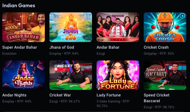 This section includes games popular in the Indian market, such as Super Andar Bahar, Jhana of God, Cricket War, and Speed Cricket Baccarat. These games resonate with Indian cultural themes and offer traditional and modern gaming experiences.
